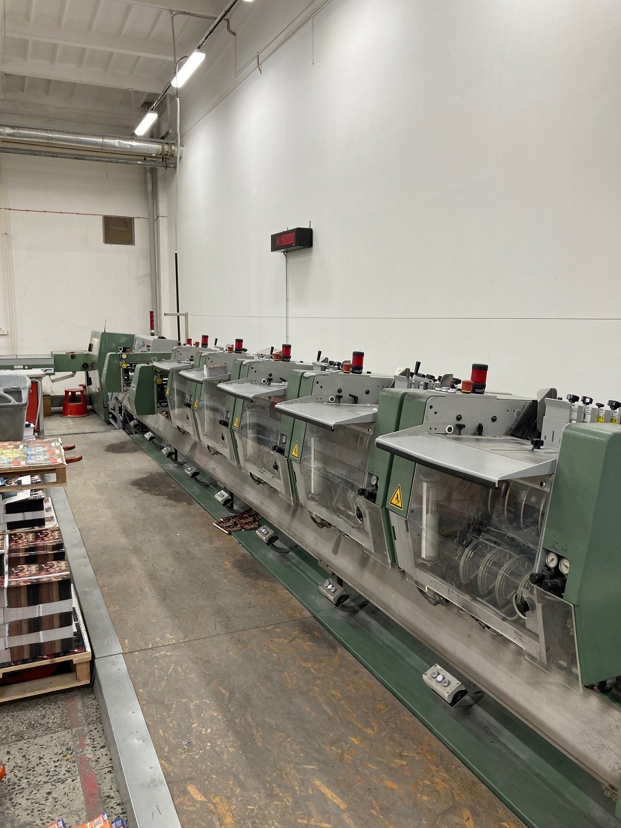 Description: <> 5x Feeders <> 2x Cover feeder <> Stitching machine <> Three knife trimmer <> Stitching heads <> Compressors <> Spare parts <> Manuals <> In working condition
