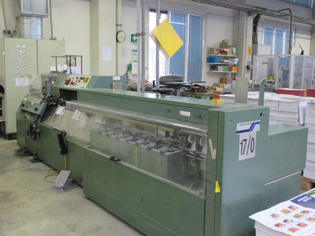 Description: <> Automatic feeder <> Hand feeder <> Gauzing station <> Vacuum pumps <> Opening station with suction bar <> center control desk <> Double swords <> Cover pressing roller <> nozzle gluing <> sewing machine 3210 <> Automatic delivery <> Driven transport band <> Box delivery to pile counter <> complete and with all standard accessories <> max. Signature format: 360x310 mm <> of min. Signature format: 100x85 mm <> of mechanical ones. Speed: 15-150 c/min <> Number of stitches: Standard 2- 10 <> staggered 2-5 <> with/without blind stitch: possible with all stitch types <> Stitch length: 15,7 mm
